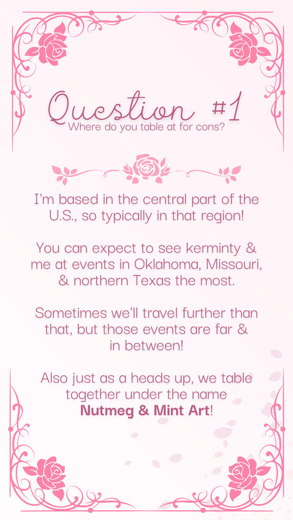 General InfoIf you ever want to buy merch from me, I table under the name Nutmeg & Mint Art with my best friend, kermintyart. I'm not likely to open an online shop more than a few times a year, so I always recommend buying things at cons if there's something you want.Because I am based in the central part of the United States, the cons I typically attend as an artist are based in the OK, MO, and northern TX areas.